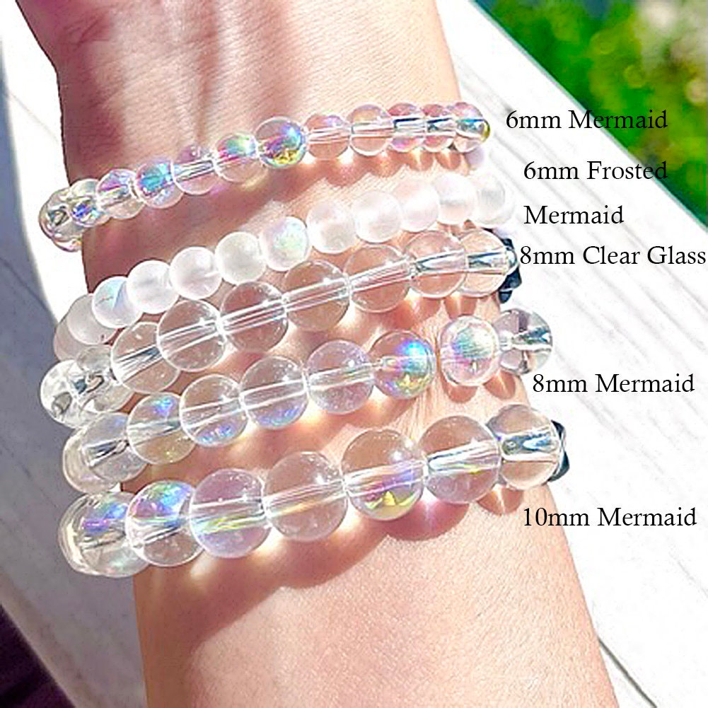 Wide range of bead types and sizes to choose from! We provide frosted mermaid beads, total clear glass beads, and mermaid beads. Each type has its own beauty. The bracelet is prettier than it looks in the photos! Elastic string enables more flexibility in wearing.