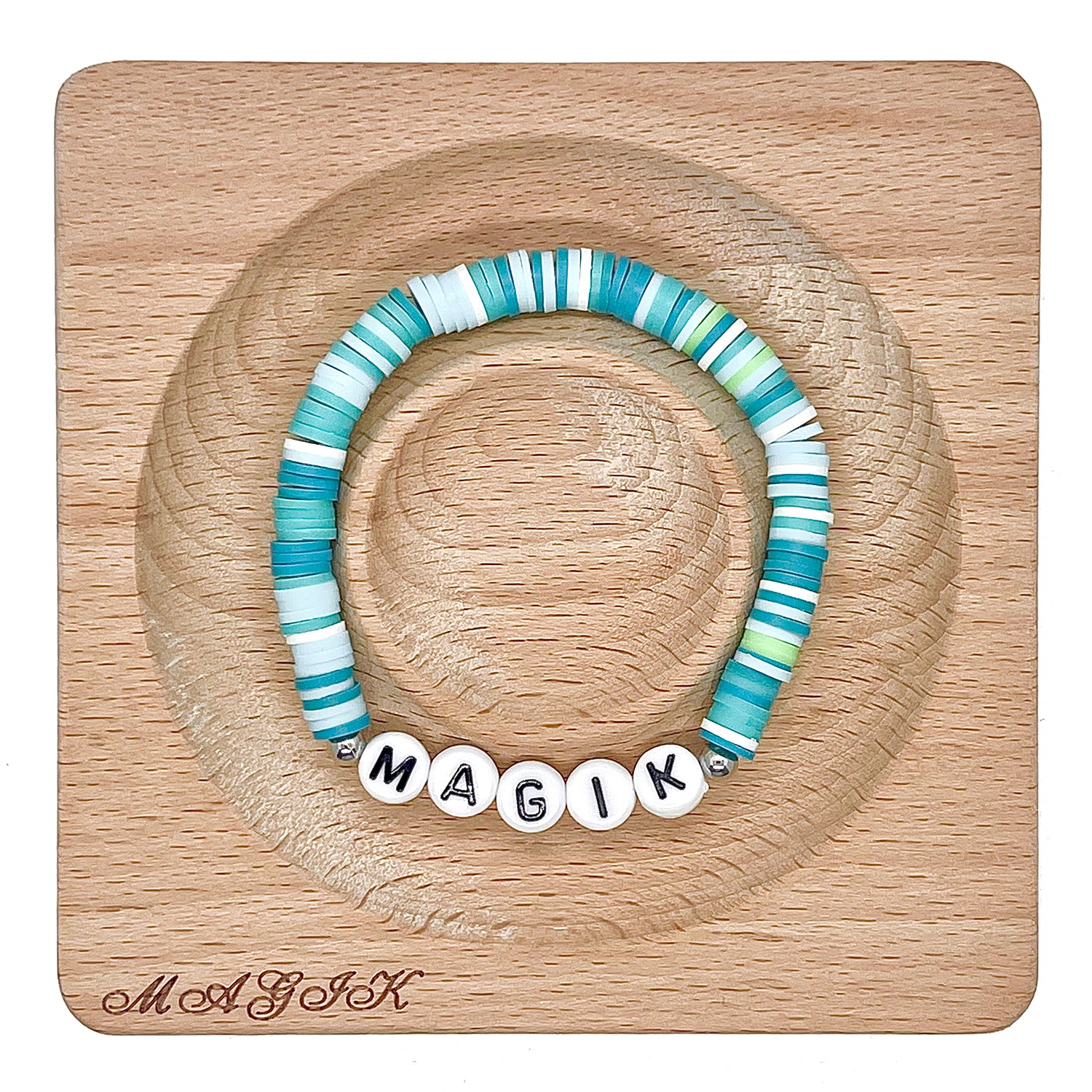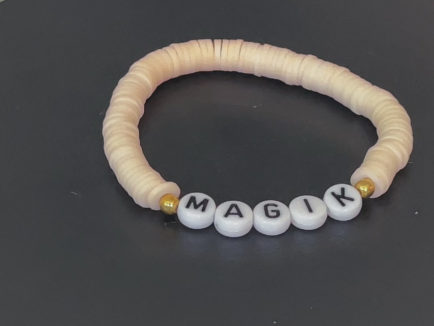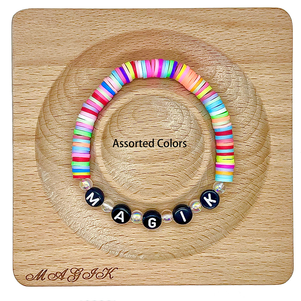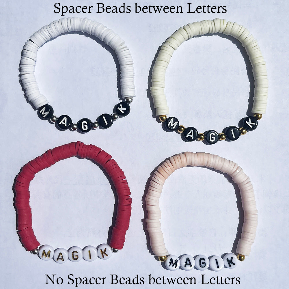 - You can now customize your bracelets with your name or title. Choose between a wide range of colors for the Heishi beads plus Alphabet beads all provided in the Drop Down Menu!
