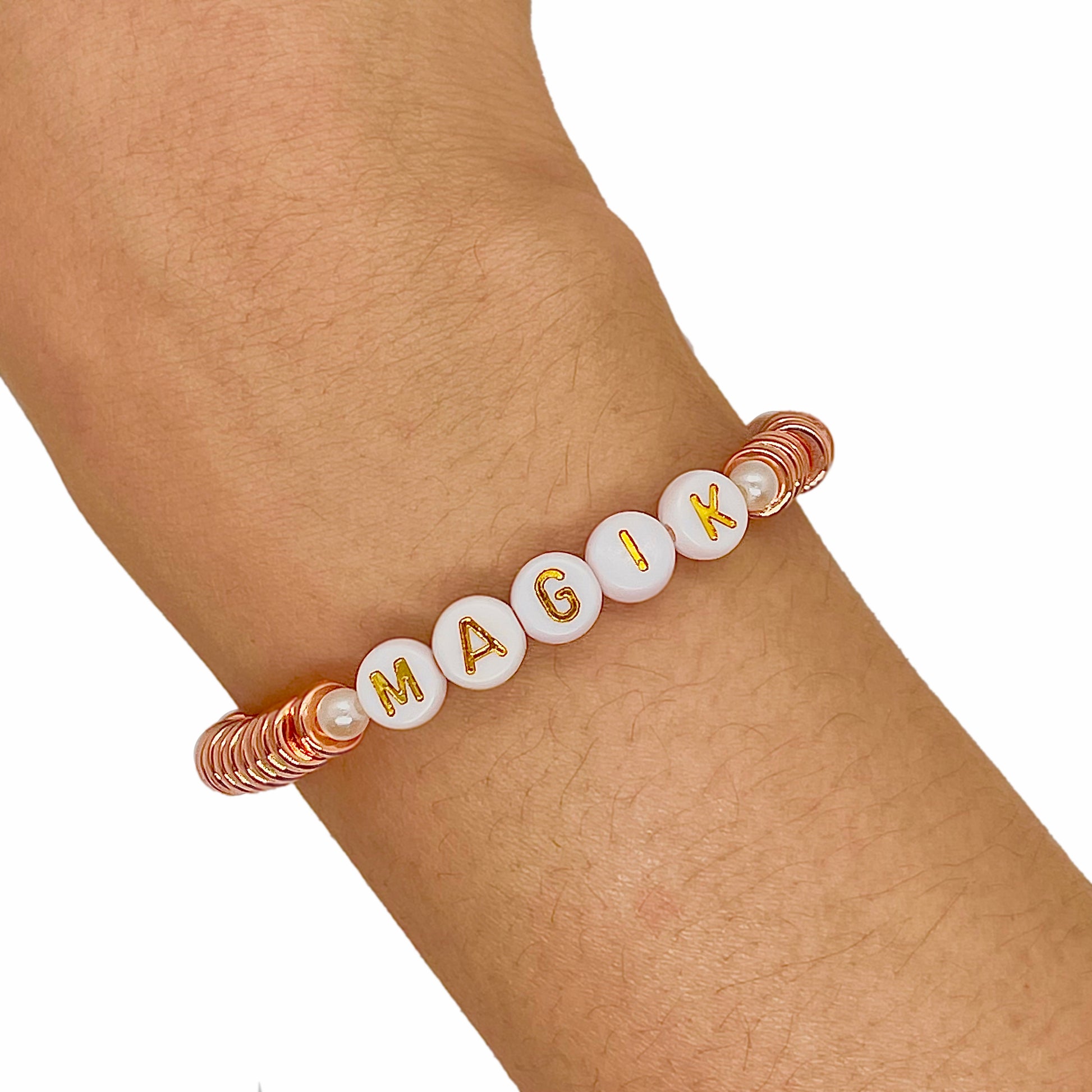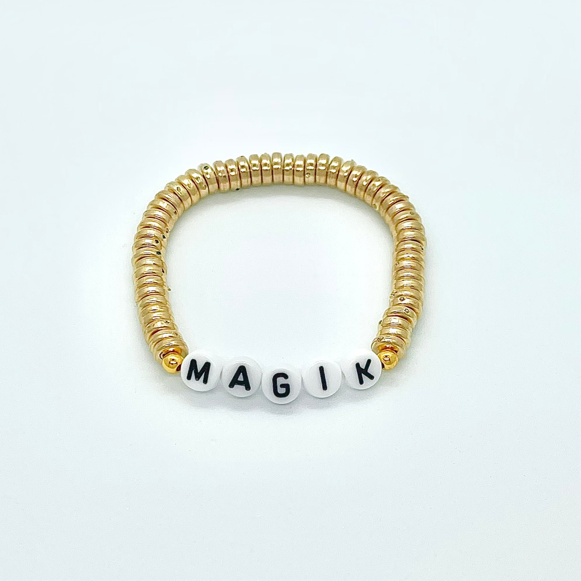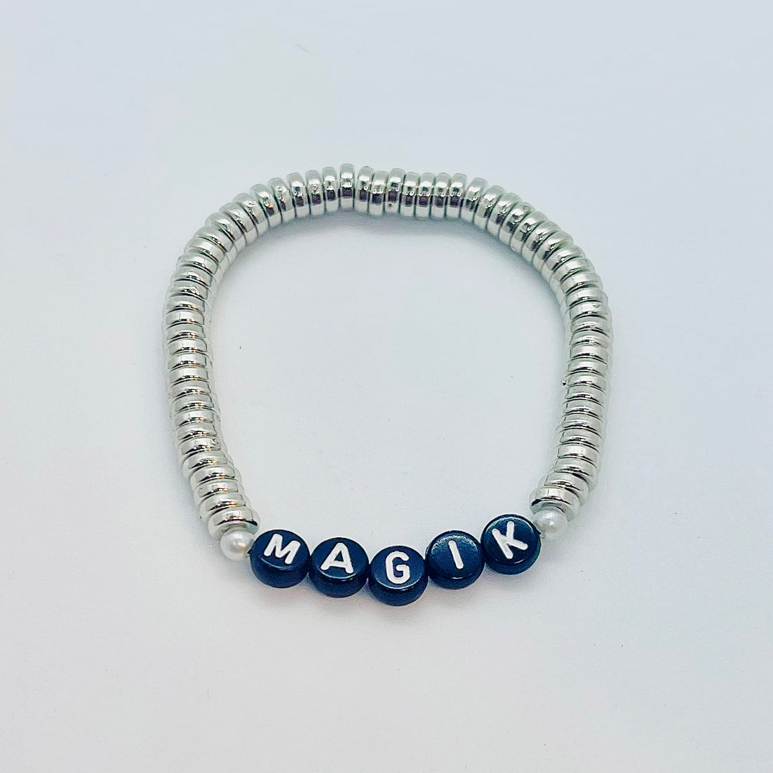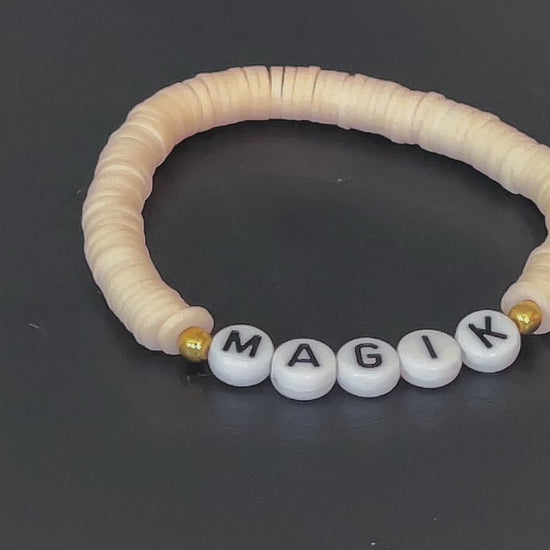 - You can now customize your bracelets with your name or title. Choose between a wide range of colors for the Heishi beads plus Alphabet beads all provided in the Drop Down Menu!