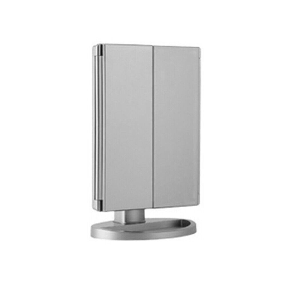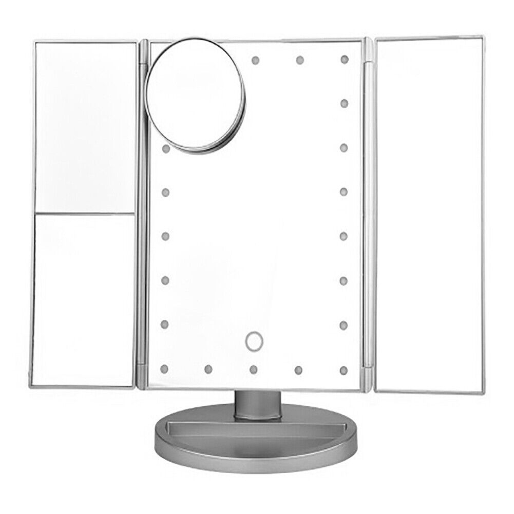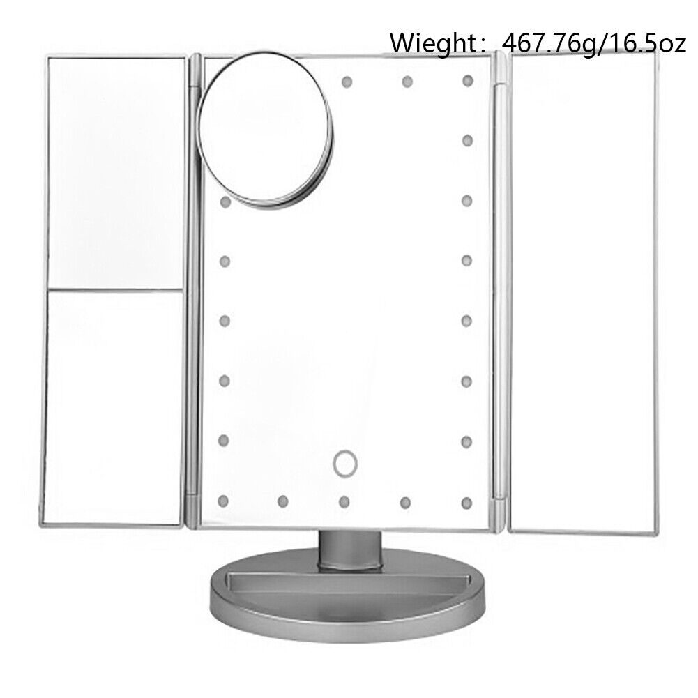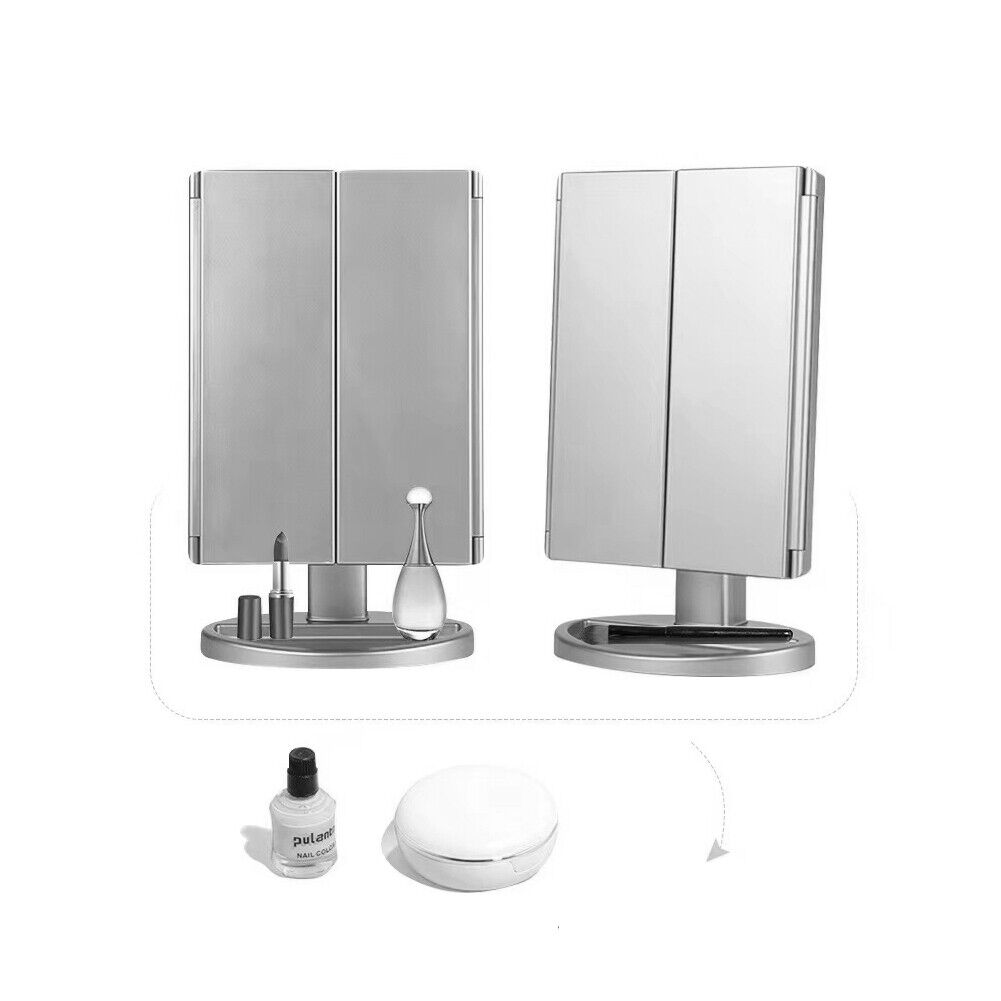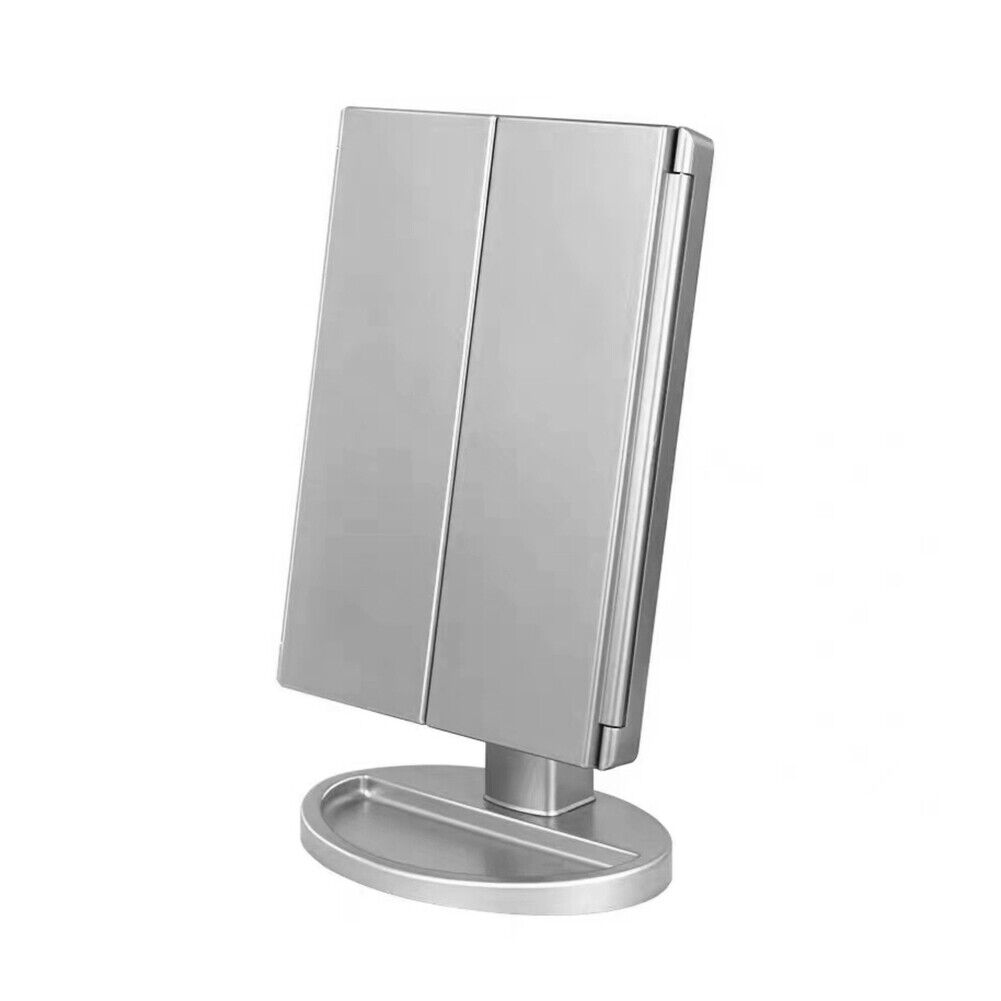 Product Title: Tri-fold Cosmetic Mirror with 22 LED Lights, 1x/2x/3x Magnification, and Touch Screen Key Features: - Equipped with 22 LED bulbs that are both eye-safe and adjustable in brightness through a long-press sensor switch.